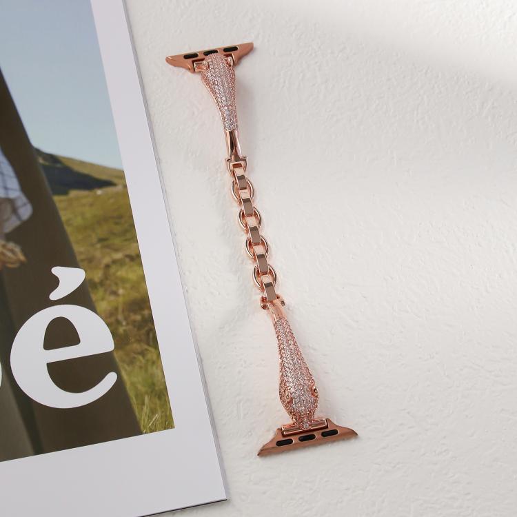 Correa de reloj con cabeza de leopardo y circonitas incrustadas de cobre para Apple Watch de 46 mm, 49 mm, 45 mm y 44 mm (oro rosa)