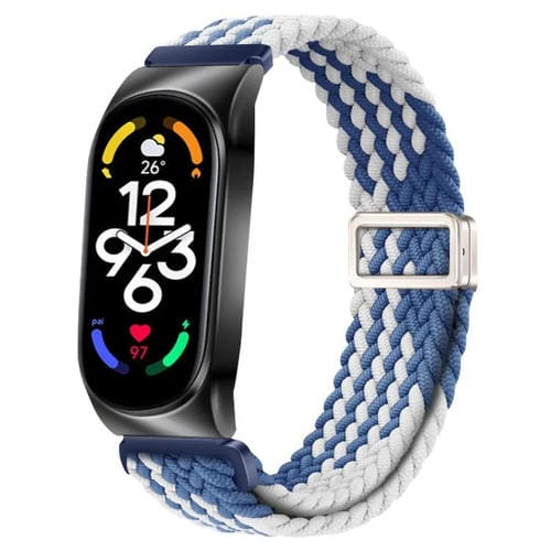 Correa de reloj elástica de nailon trenzado con hebilla magnética y marco de metal para Xiaomi Mi Band 7 (azul y blanco)