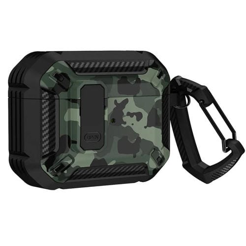 Two-Tone Printed Earphone Case with Lock Switch and Carabiner for AirPods Pro (Black + Camouflage Green)
