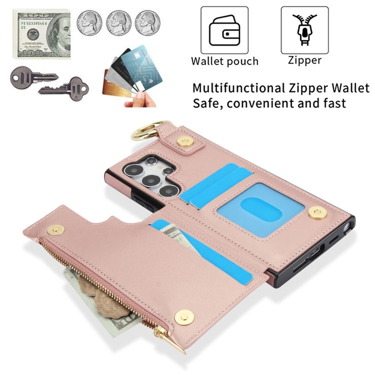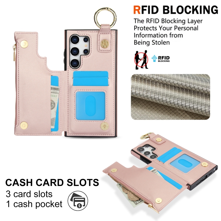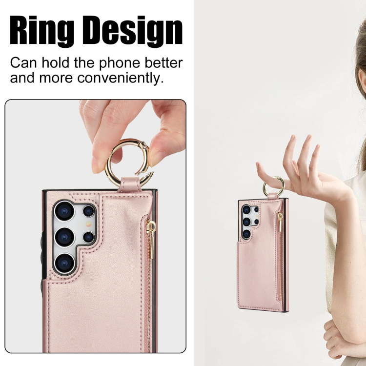 Estuche para Teléfono Samsung Galaxy S24 Ultra 5G Rfld con Cremallera y Anillo de Doble Hebilla Antirrobo (Oro Rosa)