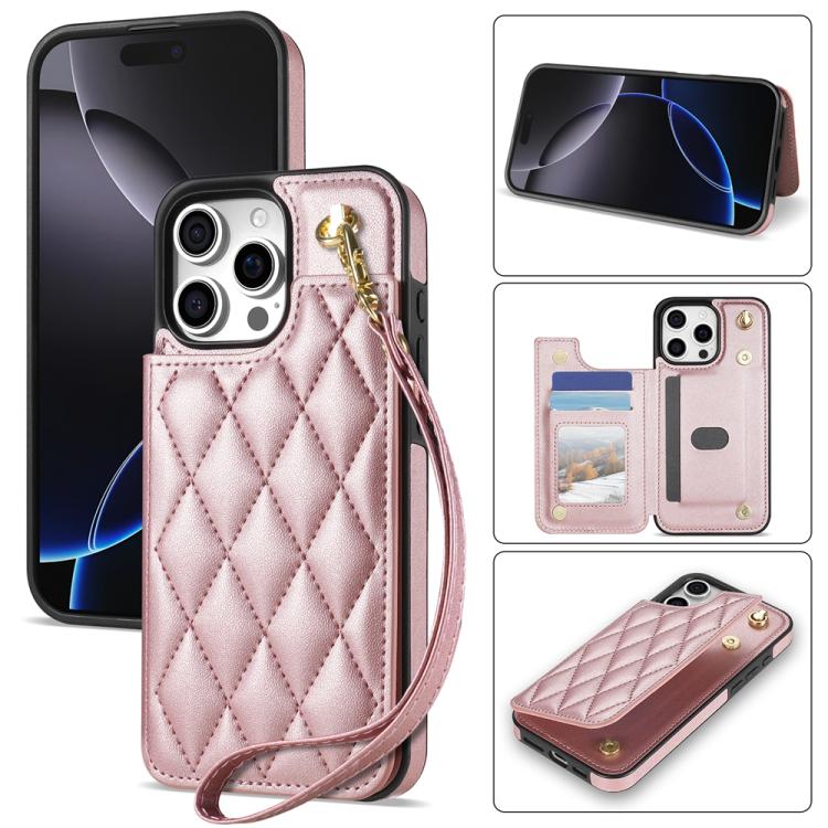 Estuche para Teléfono iPhone 16 Pro Max Ranuras Tarjetas Hebilla Doble Cordón (Oro Rosa)