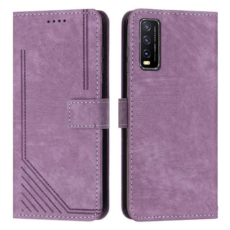 Estuche para Teléfono de Cuero con Patrón de Rayas con Sensación de Piel con Cordón para Vivo Y20 / Y20I / Y20S / Y12S Global / Y11S Global / Y20 2021 / Y20G / Y30G / Y20A Global / Y3S 2021 / Iqoo U1X (Púrpura)
