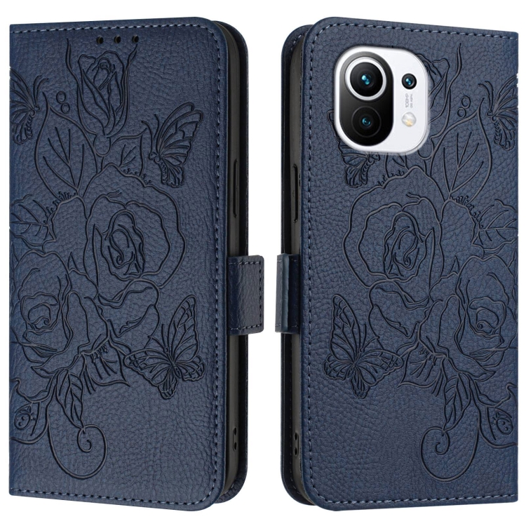 Funda de Cuero Antirrobo con Rfid y Diseño de Rosa En Relieve para Xiaomi Mi 11 (Azul Oscuro)