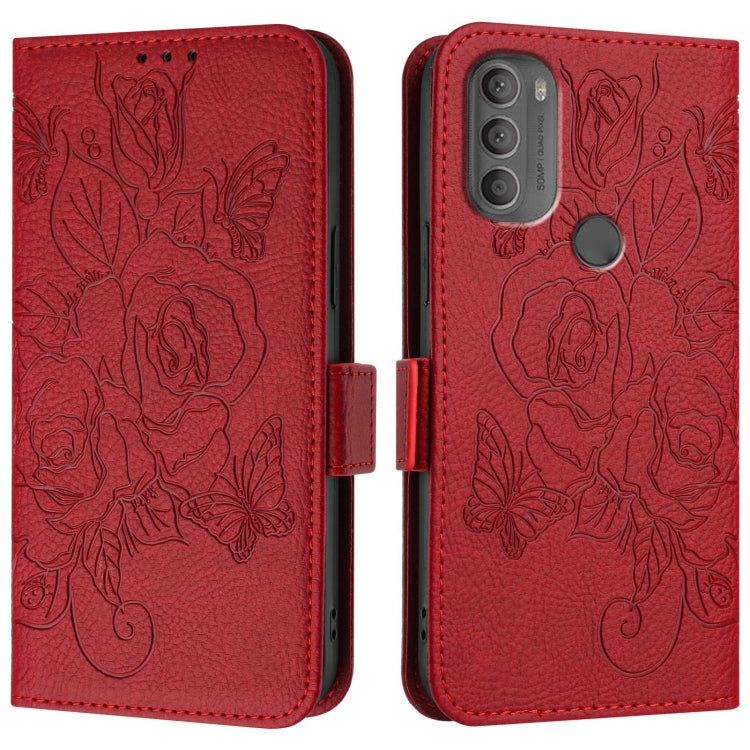 Funda de Cuero Antirrobo RFID con Relieve para Motorola Moto G71 (Rojo)