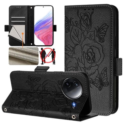 Funda de Cuero Antirrobo Rfid con Relieve En Rosa para Redmi K80 5G/K80 Pro 5G (Negra)
