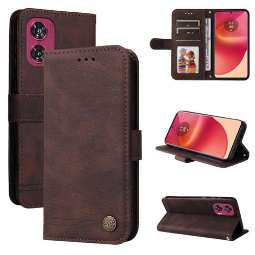 Funda de Cuero para Motorola Edge 50 Fusion con Botones de Metal y Diseño Árbol de la Vida (Marrón)