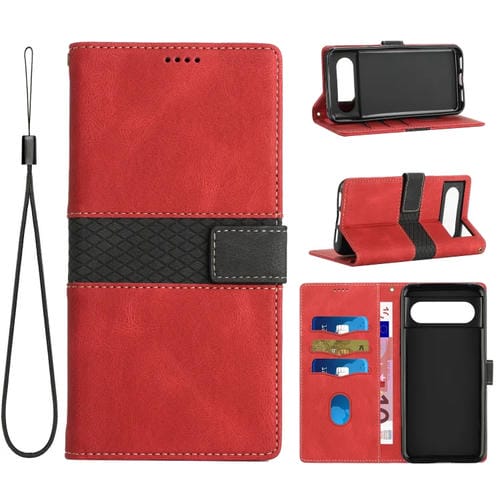Funda de Cuero Google Pixel 8 con Costuras en Cuadrícula y Cordón (Rojo)