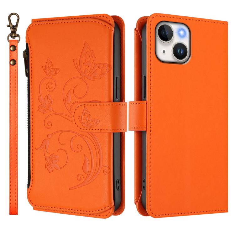 Funda de cuero con cremallera para iPhone 14 Plus, diseño de mariposas, flores y amor (naranja)