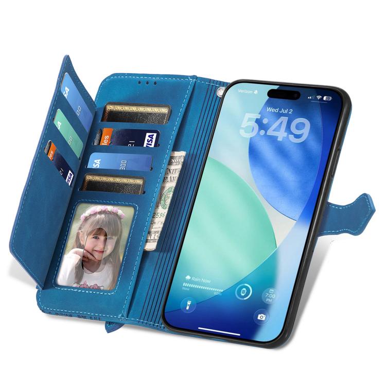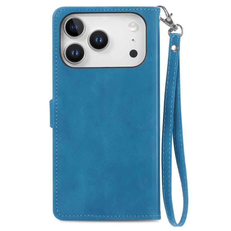 Funda de cuero con cremallera y diseño floral en relieve para iPhone 17 Pro (azul)