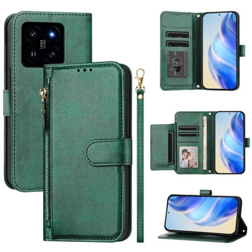 Funda de Cuero con Cremallera y Ranuras para Múltiples Tarjetas para Xiaomi 14 (Verde)