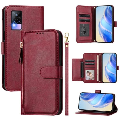Funda de Cuero con Cremallera y Ranuras para Varias Tarjetas para Vivo V20/Y73 2021 (Rojo Oscuro)