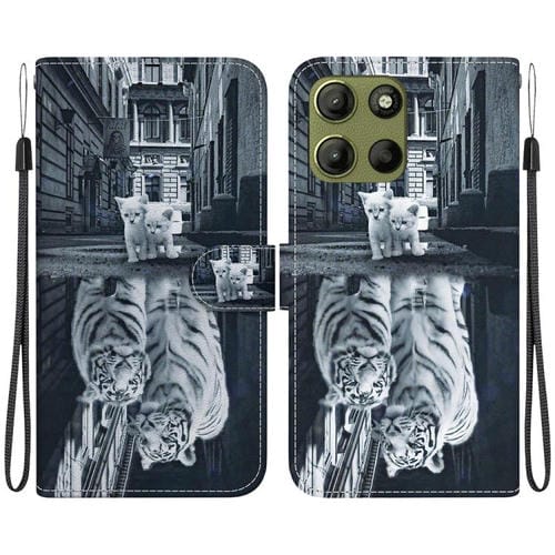 Funda de Cuero Motorola Moto G15 con Dibujo de Colores y Textura de Cristal (Reflejo de Tigre y Gato)