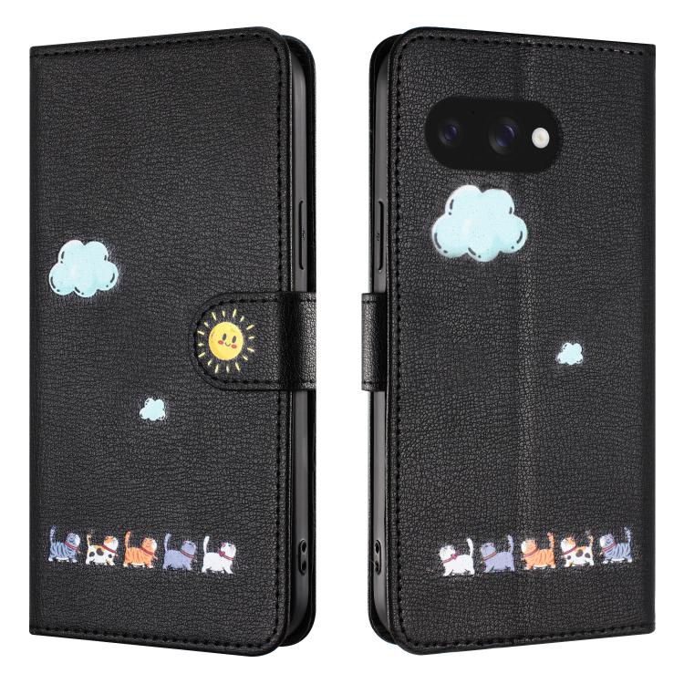 Funda de Cuero con Dibujos de Gatos para Google Pixel 9A (Negra)
