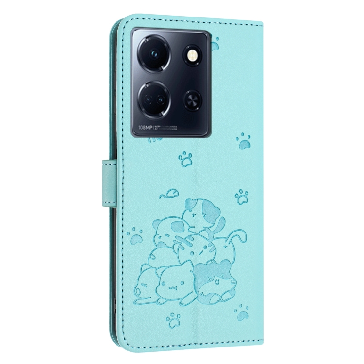 Funda de Cuero con Diseño de Gatito En Relieve para Infinix Note 30 y Note 30 5G con Cordón (Verde Menta)