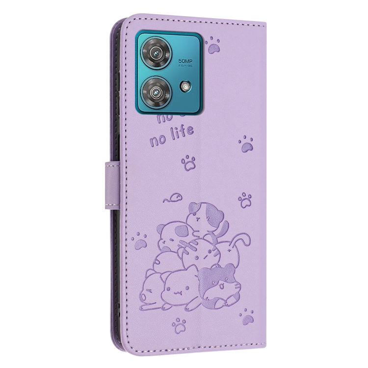 Funda de Cuero Motorola Edge 40 Neo con Diseño de Gatito en Relieve y Cordón (Morado)