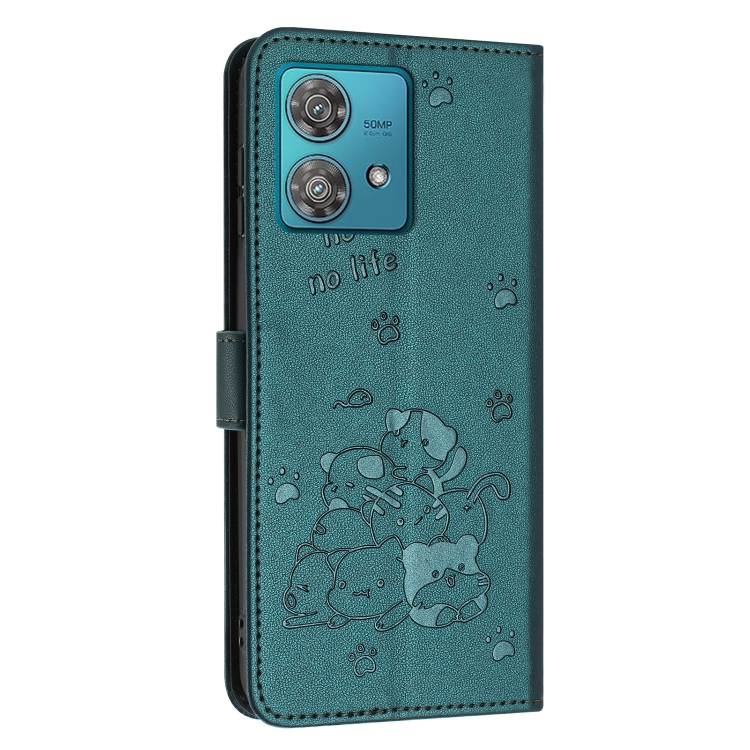 Funda de Cuero Motorola Edge 40 Neo con Diseño de Gatito en Relieve y Cordón (Verde Oscuro)
