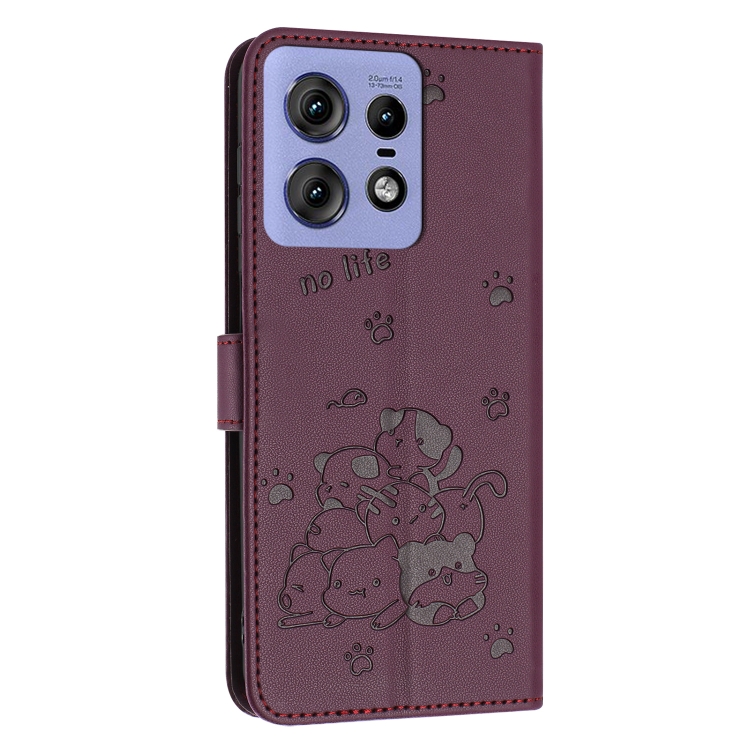 Funda de Cuero Motorola Edge 50 Pro con Diseño de Gatito En Relieve y Cordón (Rojo Vino)