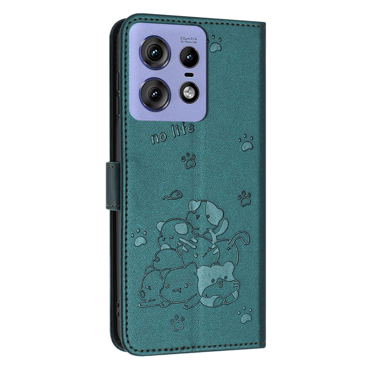 Funda de Cuero para Motorola Edge 50 Pro con Diseño de Gatito en Relieve y Cordón (Verde Oscuro)
