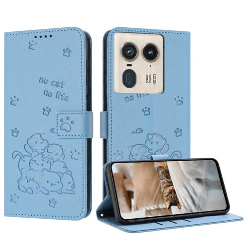 Funda de Cuero Motorola Edge 50 Ultra con Diseño de Gatito en Relieve y Cordón (Azul)
