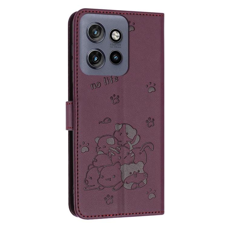 Funda de Cuero Motorola Moto G15 con Diseño de Gatito En Relieve y Cordón (Rojo Vino)