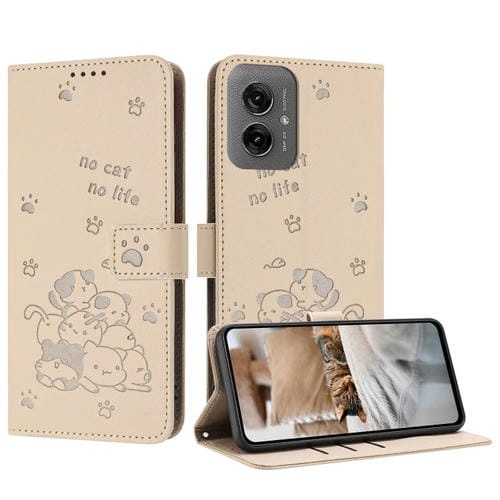 Funda de Cuero Motorola Moto G55 con Diseño de Gatito en Relieve y Cordón (Beige)