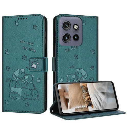 Funda de Cuero Motorola Moto S50 Edge 50 Neo con Diseño de Gatito En Relieve y Cordón (Verde Oscuro)