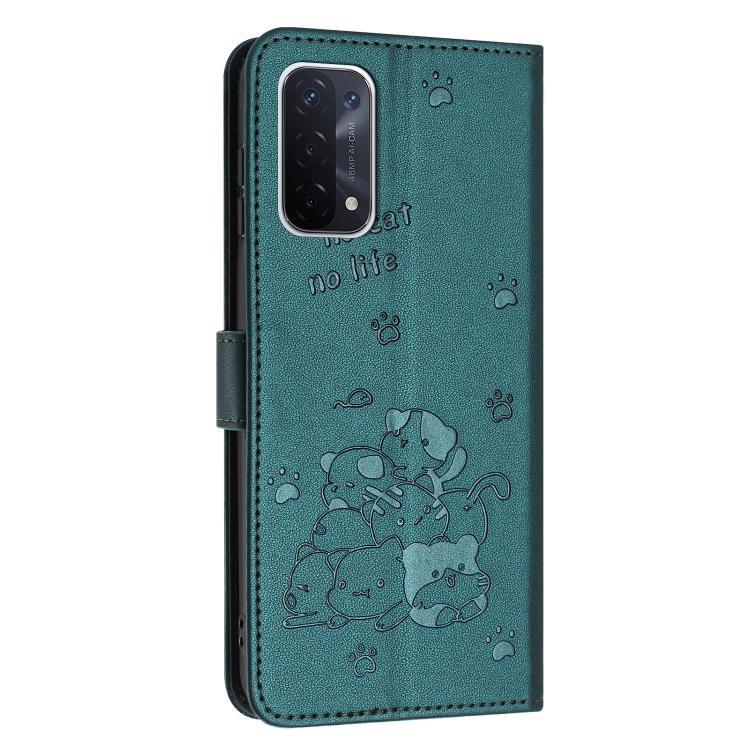 Funda de Cuero con Diseño de Gatito en Relieve para OnePlus Nord N200 5G con Cordón (Verde Oscuro)