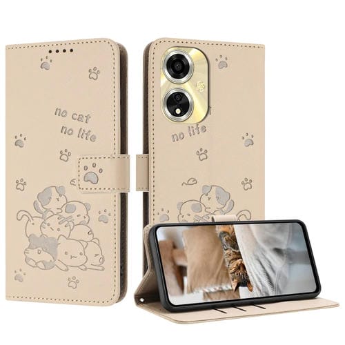 Funda de Piel con Diseño de Gatito En Relieve para Oppo A59 5G con Cordón (Beige)