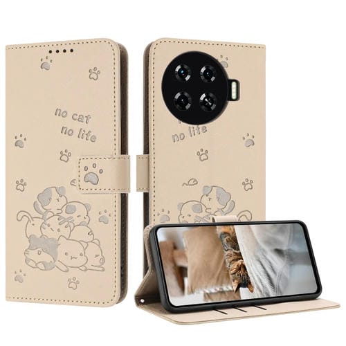 Funda de Cuero para Tecno Spark 20 Pro+ 4G con Diseño de Gatito en Relieve y Cordón (Beige)