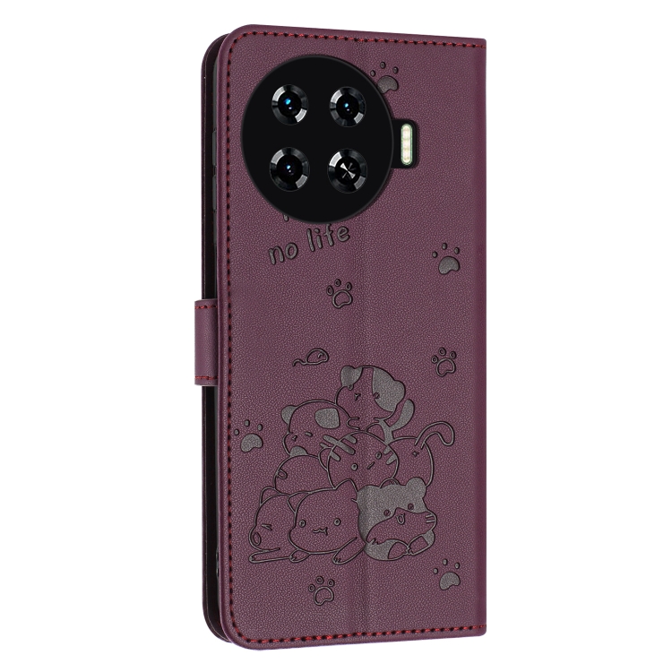 Funda de Cuero para Tecno Spark 20 Pro+ 4G con Diseño de Gatito En Relieve y Cordón (Rojo Vino)