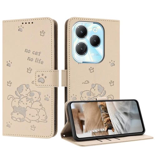 Funda de Cuero para Tecno Spark 20 Pro con Diseño de Gatito En Relieve y Cordón (Beige)