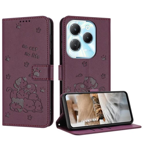 Funda de Cuero para Tecno Spark 20 Pro con Diseño de Gatito en Relieve y Cordón (Rojo Vino)
