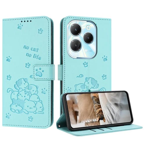 Funda de Cuero para Tecno Spark 20 Pro con Diseño de Gatito en Relieve y Cordón (Verde Menta)