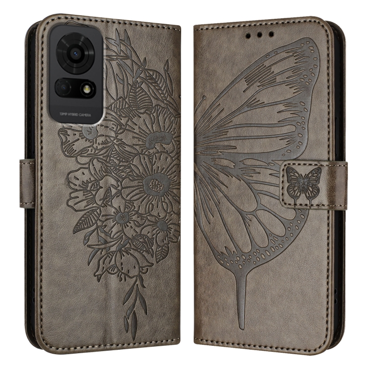 Funda de Cuero para TCL 50 Le 5G con Diseño de Mariposa en Relieve (Gris)