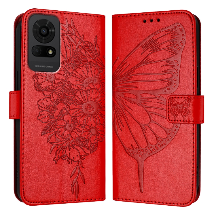 Funda de Cuero para TCL 50 Le 5G con Diseño de Mariposa en Relieve (Rojo)