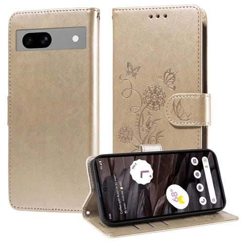Funda de Cuero para Google Pixel 7A con Diseño de Mariposas y Flores en Relieve (Dorada)