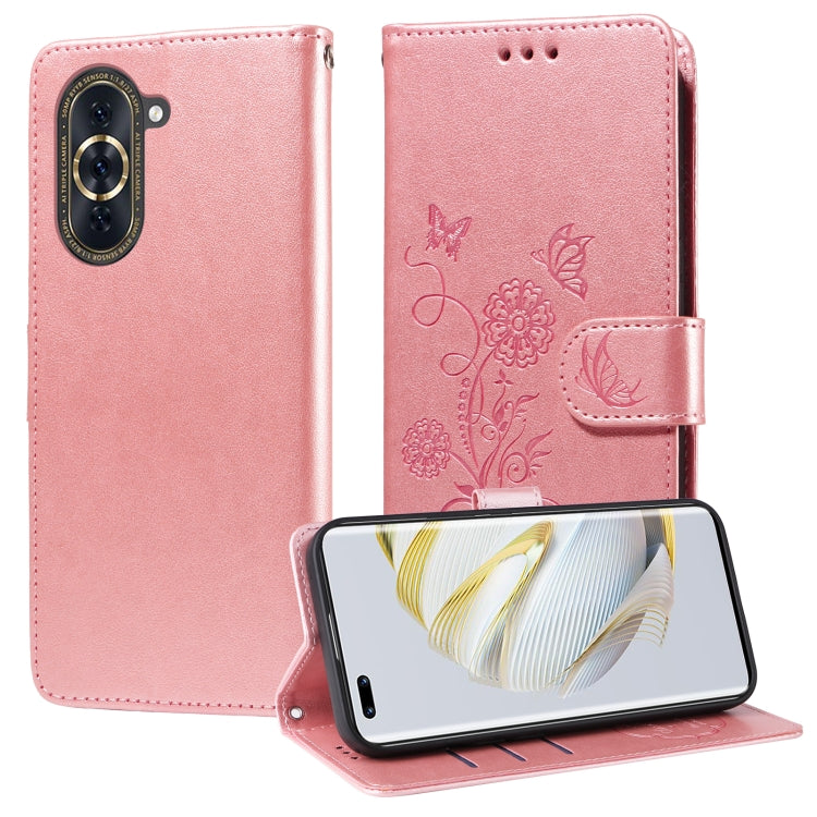 Funda de Cuero Huawei Nova 10 Pro con Diseño de Mariposas y Flores en Relieve (Oro Rosa)