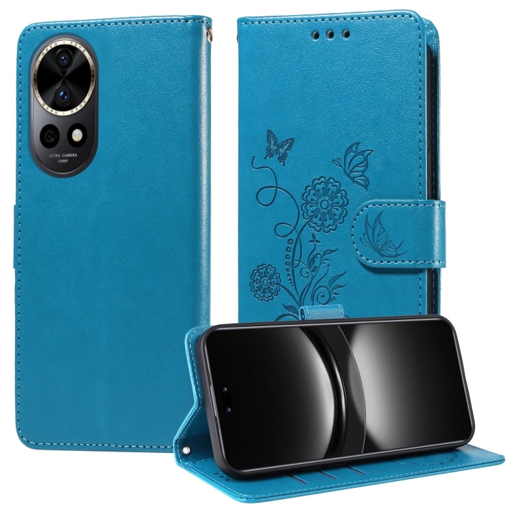 Funda de Cuero Huawei Nova 12 con Diseño de Mariposas y Flores en Relieve (Azul)