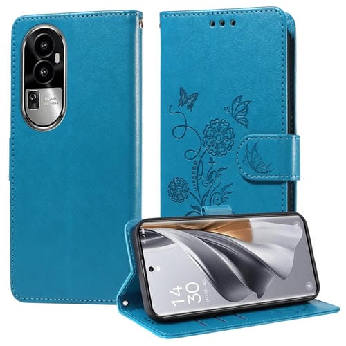 Funda de Cuero con Diseño de Mariposas y Flores En Relieve para Oppo Reno10/Reno10 Pro (Azul)