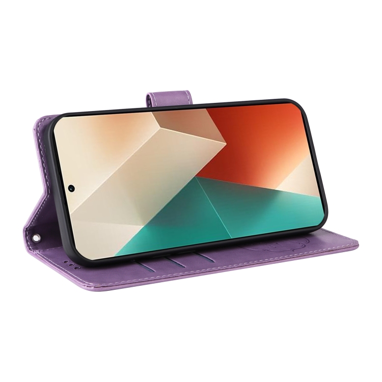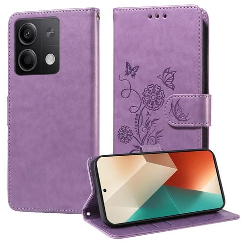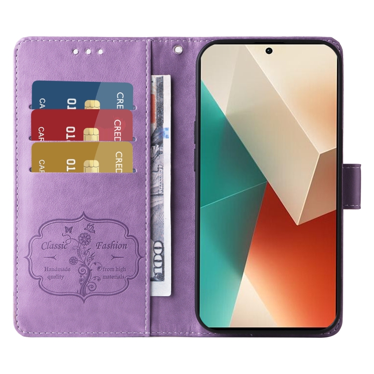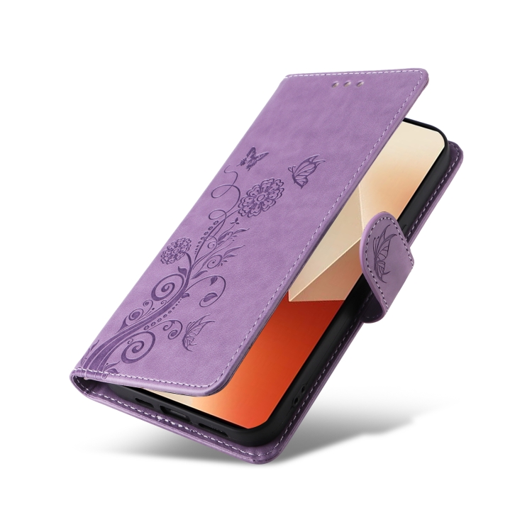 Funda de Cuero con Diseño de Mariposas y Flores En Relieve para Redmi Note 13 5G (Morado)