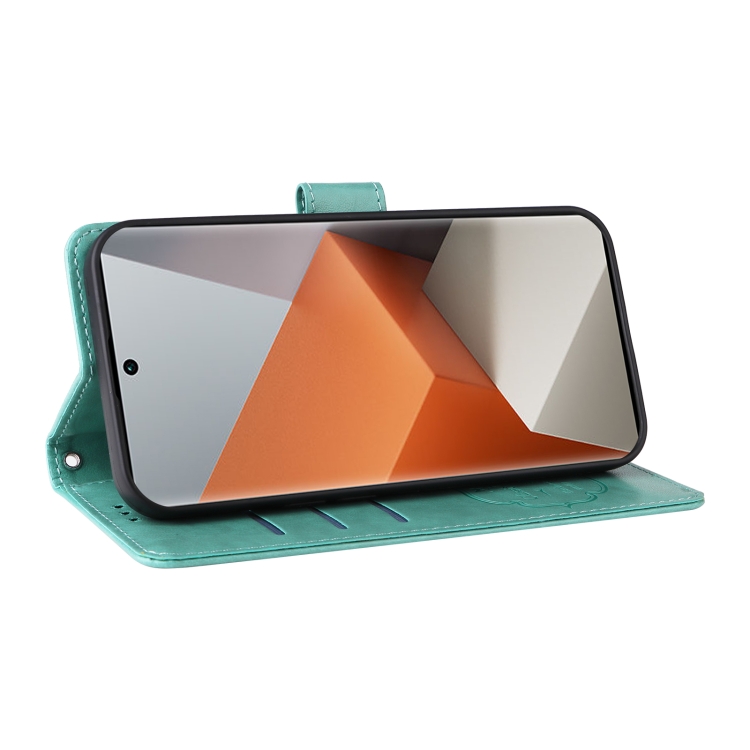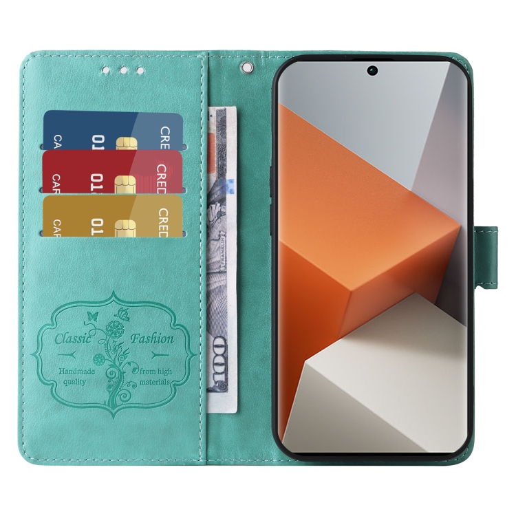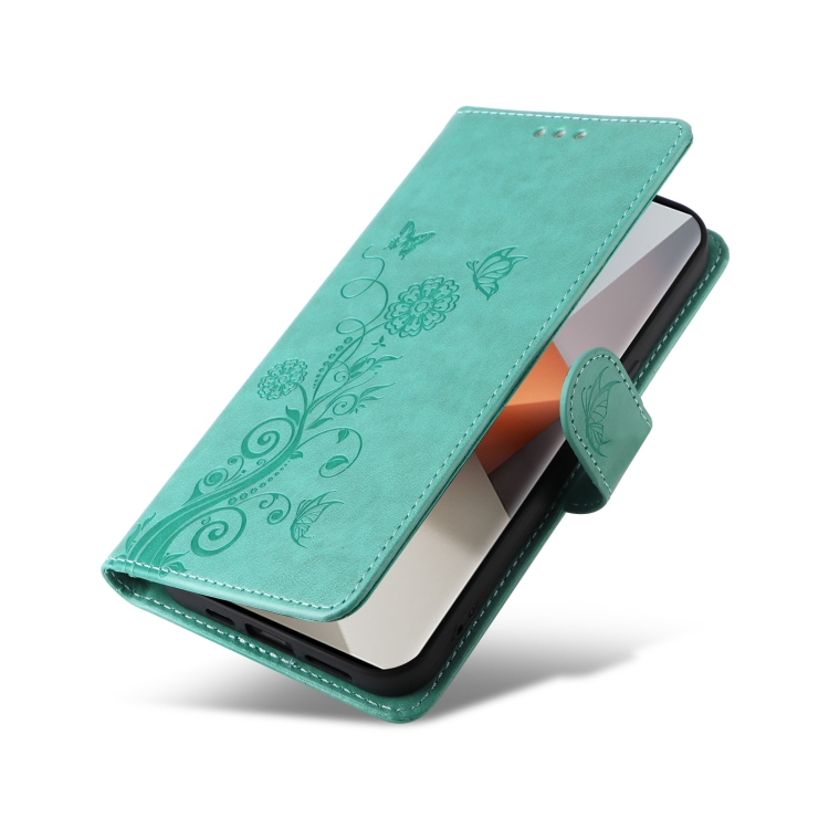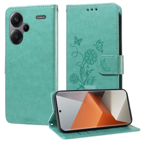 Funda de Cuero con Diseño de Mariposas y Flores En Relieve para Redmi Note 13 Pro+ 5G (Verde)