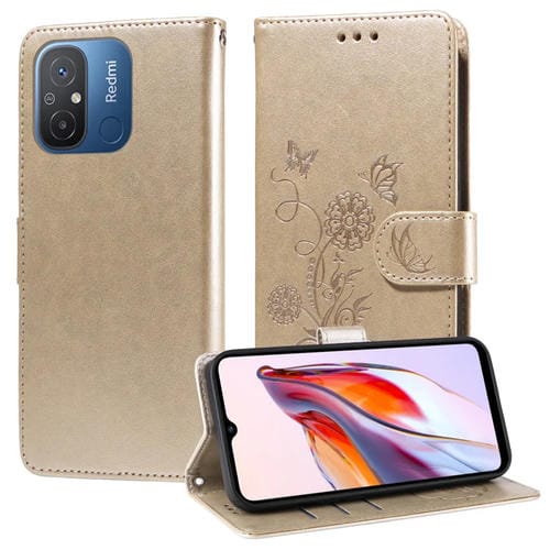 Funda de Cuero con Diseño de Mariposas y Flores En Relieve para Xiaomi Poco C55/Redmi 11A 4G (Dorada)
