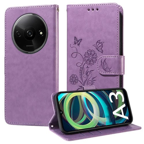 Funda de Cuero con Diseño de Mariposas y Flores En Relieve para Xiaomi Poco C61 4G/Redmi A3 4G (Morado)