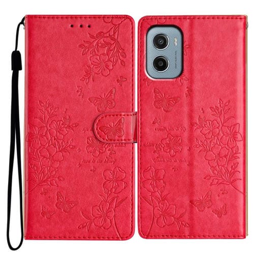 Funda de Cuero para Motorola Moto E15 con Diseño de Mariposas y Flores (Roja)