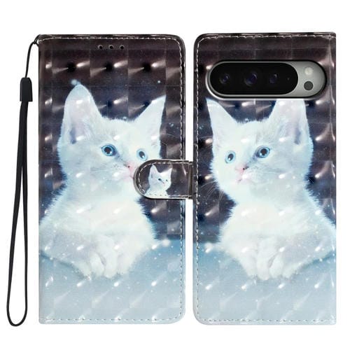 Funda de Cuero con Patrón 3D para Google Pixel 9/9 Pro (Gato Blanco)