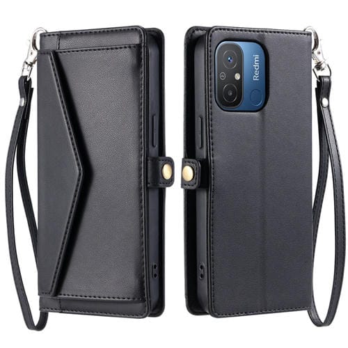 Funda de Cuero con Ranura para Múltiples Tarjetas y Cordón para Redmi 11A 4G Global Wallet (Negro)