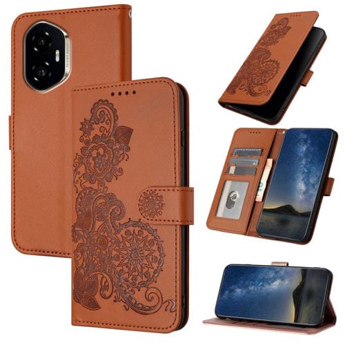 Funda de Cuero con Tapa para Honor 300 con Relieve de Flor de Datura (Marrón)