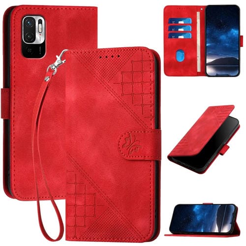 Funda de Cuero con Tapa y Cordón para Redmi Note 10 5G Yx0080 con Diseño de Mariposa En Relieve y Cuadrícula (Rojo)