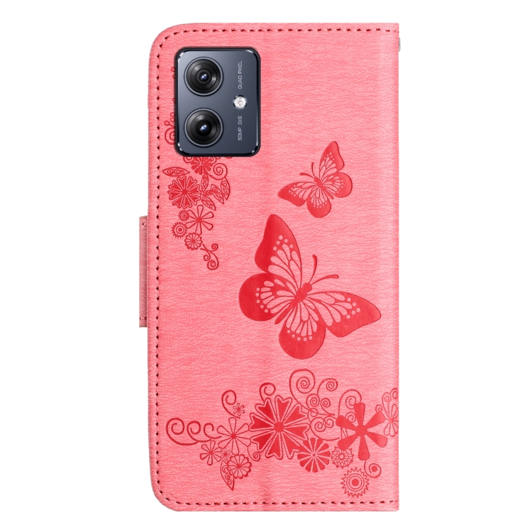 Funda de Cuero con Tapa y Mariposas en Relieve para Motorola Moto G55 (Rosa)