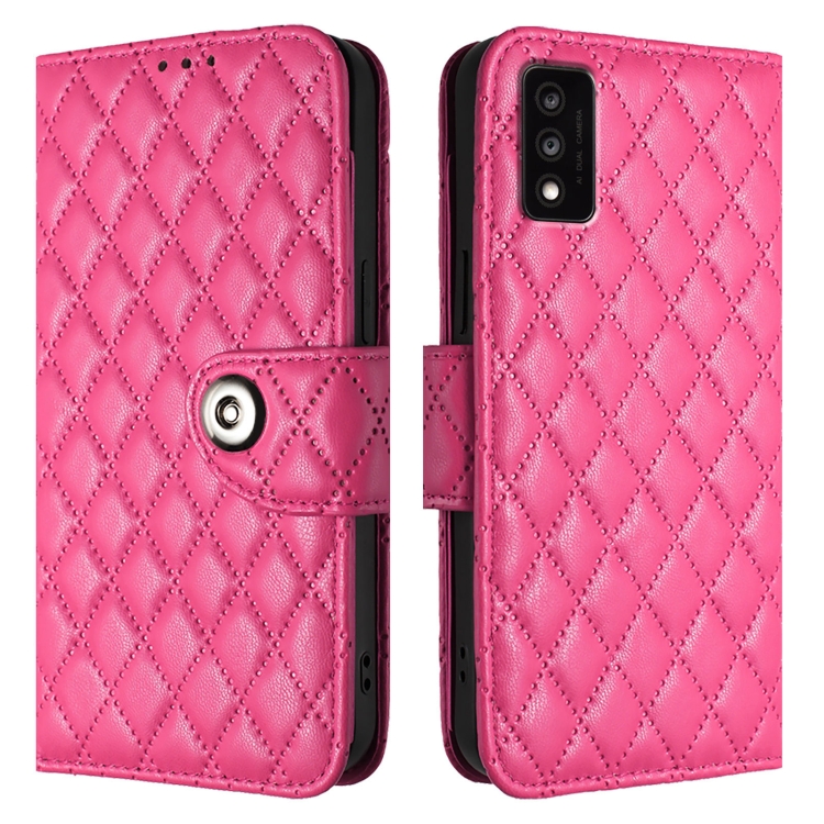 Funda de Cuero con Tapa para Teléfono TCL 30T T603Dl con Textura Rombal y Cordón (Rosa y Rojo)